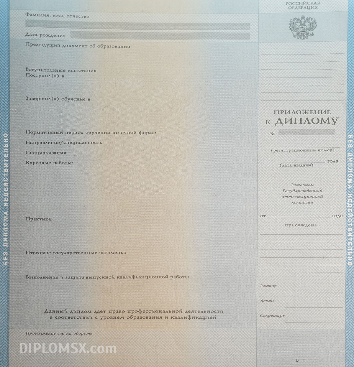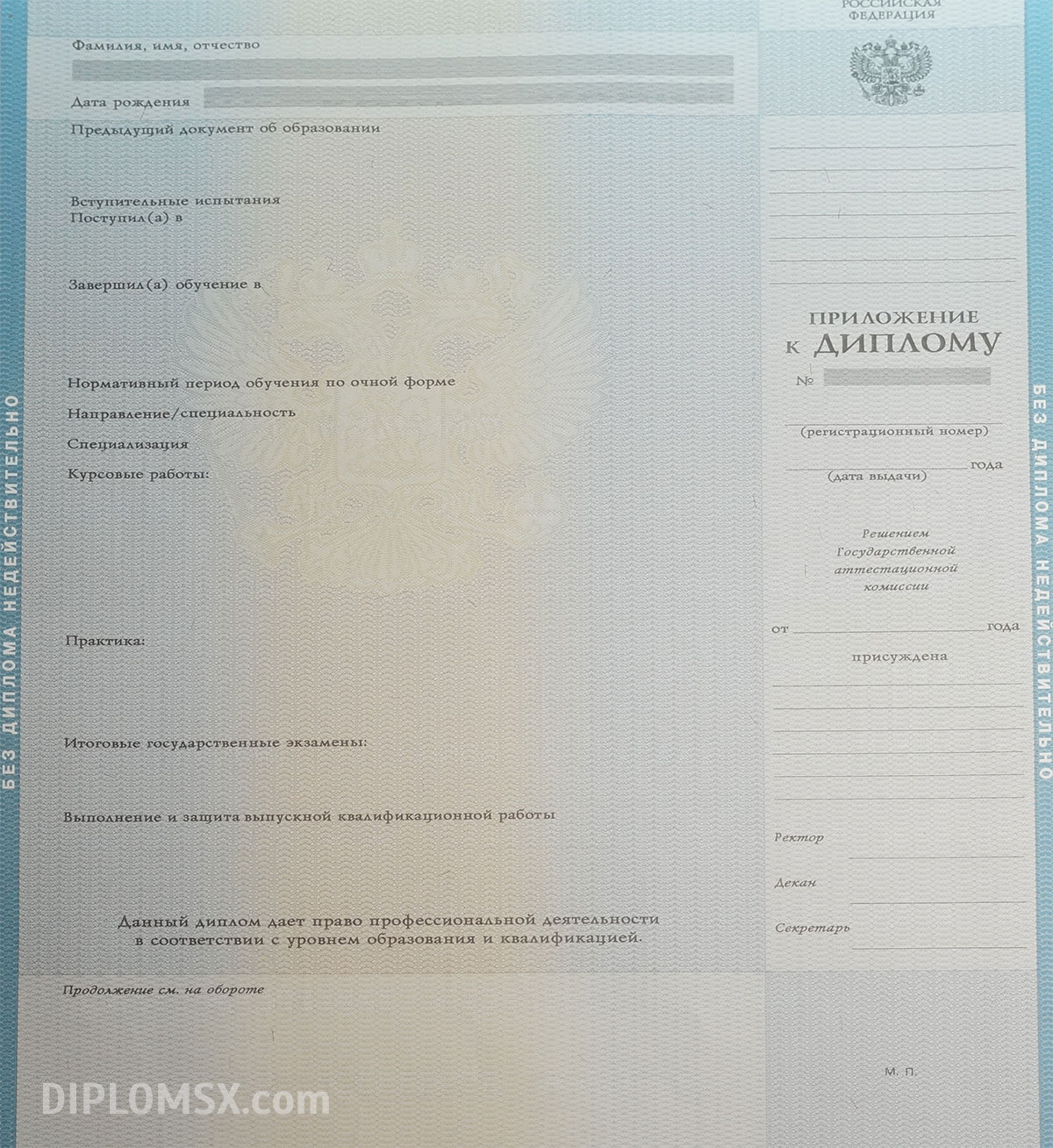 Помимо доступности наших услуг, мы предлагаем изготовление образовательных бумаг любого Вуза России на оригинальном бланке ГОЗНАК, с соблюдением всех степеней защиты: с наличием водяных знаков, голограмм и других признаков подлинности, а также печатей, подписей и положенной информации.
